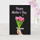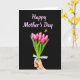 This design shows a close-up bouquet of pink tulips, their petals still mostly closed, lifted gently by a human hand at the bottom edge as if offering them to someone special ❤️. The flowers stand out against a deep black background, making the soft pink tones feel intimate and focused. Green stems and leaves fan outward with a natural curve, suggesting a quiet, affectionate moment like a shy gift being passed between friends. A gray-and-white striped ribbon wraps the stems near the lower center, tied neatly to keep the bundle together. Near the top area, a small winged insect hovers in midair, adding a light touch of life and motion 🌼. A short message sits above the bouquet in a rosy pink, flowing lettering, centered near the upper portion of the card. The petals catch a gentle highlight while the leaves show subtle shadows, and the ribbon’s stripes are clearly visible against the dark backdrop.