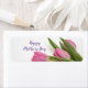 These labels have three pink tulips in the lower right corner. Purple script is available for personalized text (currently reads: 'happy mother's day'). Text can be edited or deleted.