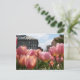 Bug's-eye view of pink tulips with a slight yellow base. The North End of Boston in the background.
