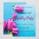 Pink tulips on a blue invitation