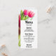 Wedding menu card with a beautiful spring photograph featuring 2 pink tulips and bright green leaves.