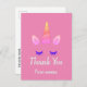 Send thanks to family and friends with these customizable thank you postcards. It features a picture of a unicorn attending a birthday event. Personalize it by adding your name, message and other details. This pink unicorn thank you postcard is perfect for birthday parties, baby showers, and personalized thank you cards.