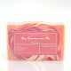 A label for soap or cosmetics products with a pink background and white text. Features space for your company name, ingredients, business information, and more.