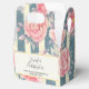 Small favor box with a beautiful pattern featuring pretty pink flowers layered over top a striped pattern composed of blue and cream colored stripes.