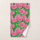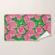 Towel set in a pattern of watercolor roses, in shades of deep fuchsia to pastel pink, against a background of green leaves