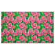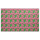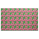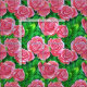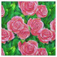 Fabric in a pattern of watercolor roses, in shades of deep fuchsia to pastel pink, against a background of green leaves