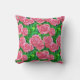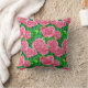 Throw Pillow in a pattern of watercolor roses, in shades of deep fuchsia to pastel pink, against a background of green leaves