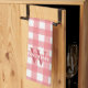 Pink gingham kitchen towel with your initial in pale red and last name in white.