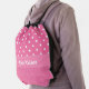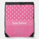 Cute little drawstring backpack perfect for anyone. It features a pink and white polka dot background one top and bottom. A pink stripe runs through the center. You customize the text in the middle.