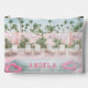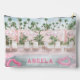 This trendy Poolside zipper pouch features a row of pool loungers with pink and white striped umbrellas set up near a swimming pool. You can personalize with a name. On the back is a repeat of the front design.