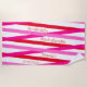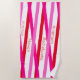 Get the party started with these cute beach towels that are easy to personalize for your bachelorette party, hen night, or girls' weekend! Modern party style design features a geometric pattern with bold pink lettering on a patterned white, pink and red background. Personalize with four lines of custom text; shown with the bride's name, event type, location and date. All text can be edited per your liking.