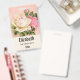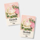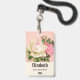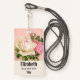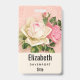 Personalized name badge with a floral rose bouquet with white and pink flowers. Background is pink with a floral pattern. Pretty and elegant design.
