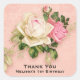 Birthday thank you stickers with a floral rose bouquet with white and pink flowers. Background is pink with a floral pattern. Pretty and elegant design.