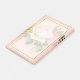Sticky notes with a floral rose bouquet with white and pink flowers. Background is pink with a floral pattern. Pretty and elegant design. A semi-transparent layer on top with a faux gold foil border.