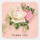 Thank you stickers with a floral rose bouquet with white and pink flowers. Background is pink with a floral pattern. Pretty and elegant design.
