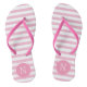 NewParkLane - Monogrammed Flip flops, with an abstract pattern of pink and white stripes, and a hot pink badge for your initials or personalized text.