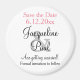 Save the Date written in pastel pink against white background. Bride and Groom's Names in Black script. Designs by TamiraZDesigns.