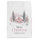 This charming Christmas gift bag features a soft watercolor illustration of a pink cottage nestled among snowy evergreens and bare winter trees. The elegant "Merry Christmas" greeting is printed in a delicate serif font, adding a cozy and festive touch. Customizable with a family name, this whimsical bag is perfect for holding small gifts, party favors, or holiday treats, spreading warmth and joy to your seasonal celebrations.