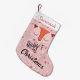 Create a special Christmas stocking keepsake for new baby. Personalize the name on this pink polka dot stocking accented with a cute oink fox face and typography that read's "Baby's First Christmas". It can be hung on reverse side for future Christmas years without the "first Christmas" type.
