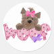 A fluffy dog wearing a pink bow and text that reads "Woof" is featured on cute dog T-shirts, tote bags, stickers, mugs, mousepads, and more!