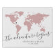 Rose Gold Blush Pink world map destination wedding guest book alternative signature canvas board for an elegant travel theme reception or party. Move the heart to any location by clicking 'customize further' - the fonts and colors can also be edited to work with any color scheme.