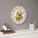 A wall clock with pink and yellow roses from vintage botanical artwork with blue butterflies on a faux parchment background and antique numbers in black on an pink background.