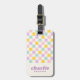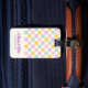 Luggage featuring a light pink, yellow, purple and aqua blue checkerboard pattern and your name in a retro style, purple font with a line of custom text below. All colors are customizable. Add your contact information on the back
