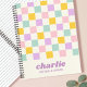 Notebook featuring a light pink, yellow, purple and aqua blue checkerboard pattern and your name in a retro style, purple font with a line of custom text below. All colors are customizable.