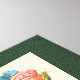 An antique reproduction of pink and yellow roses botanical art with blue butterflies on a hunter green, faux canvas background.