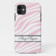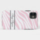Stylish and girly zebra print iPhone 5 case designed with a pattern of pink and white zebra stripes, and personalized with your name or custom text.