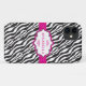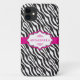 This iPhone case is all about being a girly girl. Zebra print makes a striking background for an ornate frame on a polka dot fuchsia ribbon. A name or other message is showcased in the frame surrounded by curly ornaments. Available in alternate colors with matching products.