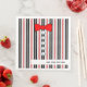 Completing the look, there's a bright red bow tied five silver metallic buttons. The text area, at the bottom, can be personalized with a name, occasion or special event. You can also remove the text block.