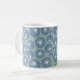 This mug has a mid-century modern design of dusty blue circles with white starbursts inside on a field of seafoam green.