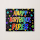 This exciting and lively birthday-themed jigsaw puzzle design has the message "HAPPY BIRTHDAY, PIPER" with the characters having a colorful rainbow spectrum inspired gradient pattern, along with a vibrant field of stars background pattern. A vibrant puzzle like this might be a fun way to send birthday greetings to somebody named Piper. [~Z0000468]