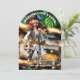 A vibrant and striking 3D ai cartoon graphic of a re-haired pirate captain wearing his uniform and a jolly roger hat. He is standing in front of a large scroll with nautical navigations on it and a wooden treasure chest filled with gold bullions and coins appears to his right. Large jungle leaves hang down from trees above him. This dramatic and eye-catching illustration has editable white, edged with black text, templates which may be personalized to suit your occasion. They are ideal for both adults and teens that may be hosting an "ahoy matey", nautical or pirate theme fancy dress / costume party.