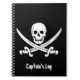 This notebook features a classic pirate flag Jolly Roger with crossed swords. White on black, and as shown with the title "Captain's Log", but this is a template, so you can make it "Jack's Notebook" or anything you'd like!