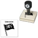A whimsical black and white illustration of a pirate flag waving proudly. The flag features a classic skull and crossbones design with an eyepatch, symbolizing the adventurous and rebellious spirit of pirate lore. This playful and iconic pirate flag stamp is perfect for adding a touch of nautical fun to any project.