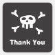 Kids pirate birthday party favor seals/stickers featuring a white cartoon skull on a black background and the customizable text "Thank you".