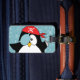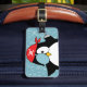 Cute black and white pirate penguin cartoon graphic drawing wearing an eye patch and a hook for hand and a wooden peg leg with a blue background with white skulls and a skull warning logo on his bandana. Great for pirate and / or penguin lovers. Fully customizable. The back is ready to personalize and add a name, address and phone number.