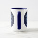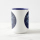 Mug featuring the zodiac symbol for Pisces in soft silver blue, as a round medallion, overlaid with the stars of the constellation, against a starry sky background graded from deep midnight blue to black.