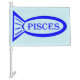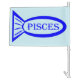This awesome car flag features an outline of a blue fish with pretty detailing inside. There is also text that says Pisces inside the outline of the fish. This design is ideal for people with Birthdays Between 19 February and 20 March.There is customizable text on the back so you can personalize your car flag.