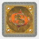 This magnificent symbol is depicted with carved gold and embossed jeweled red lacquer against a leather background. The four suns rendered in gold represent the totality of the seasons. The center of each sun features the embedded Pisces birthstone color, aquamarine.