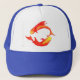 Ablue and white trucker hat for a Piscean with two brilliant orange fish on a deep blue background, from a watercolour painting by Judy Adamson.