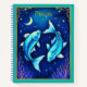 Journal in a Pisces illustration featuring two turquoise blue fish swimming in opposite directions against a starry, deep blue background. A crescent moon and stars enhance the celestial theme, evoking the imaginative spirit of the Pisces zodiac sign.