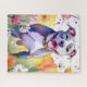 A digital art image of a pit bull dog with its tongue out stands amidst vibrant flowers and a colorful abstract background. Bright splashes of color and whimsical details create a lively scene.