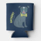 This custom can sleeve features an illustration of a handsome pup. This dapper dog is wearing a pair of teal colored glasses and a lime green bow tie and is set against a navy blue background. Next to the pit bull puppy graphic is a spot to add a name in coordinating lime green letters.