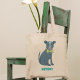 This custom tote bag features an illustration of a handsome pup. This dapper dog is wearing a pair of teal colored glasses and a lime green bow tie. Beneath the pit bull puppy graphic is a spot to add a name in coordinating teal letters.
