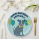 Throw a paw-some dog-themed birthday party with these personalized party supplies. These paper plates are ready to be customized with your message and feature an illustration of a pit bull puppy wearing glasses and a bow tie surrounded by party balloons.