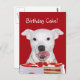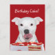 White pitbull terrier licks her chops over a birthday cake dog lovers celebration postcard