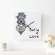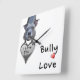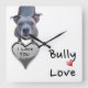 This wall clock shows our cute Blue Nose Pitbull named Sarge. While holding a silver heart between his paws that has the words, "I love you," inside, Sarge is looking up at you with his ears flapping and the most adoring look on his face. To the side are the words, "Bully Love, " with a little red heart. A perfect wall clock for every Pitbull lover.